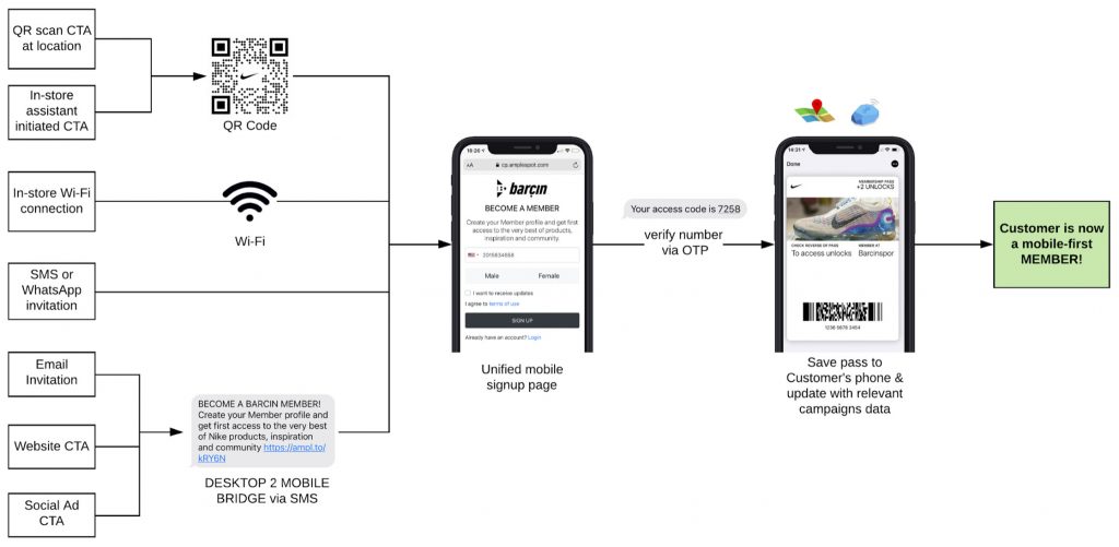 On location: FREE WiFI onboarding or QR code in- and out- of store. Sign-up and add the Membercard to the wallet.